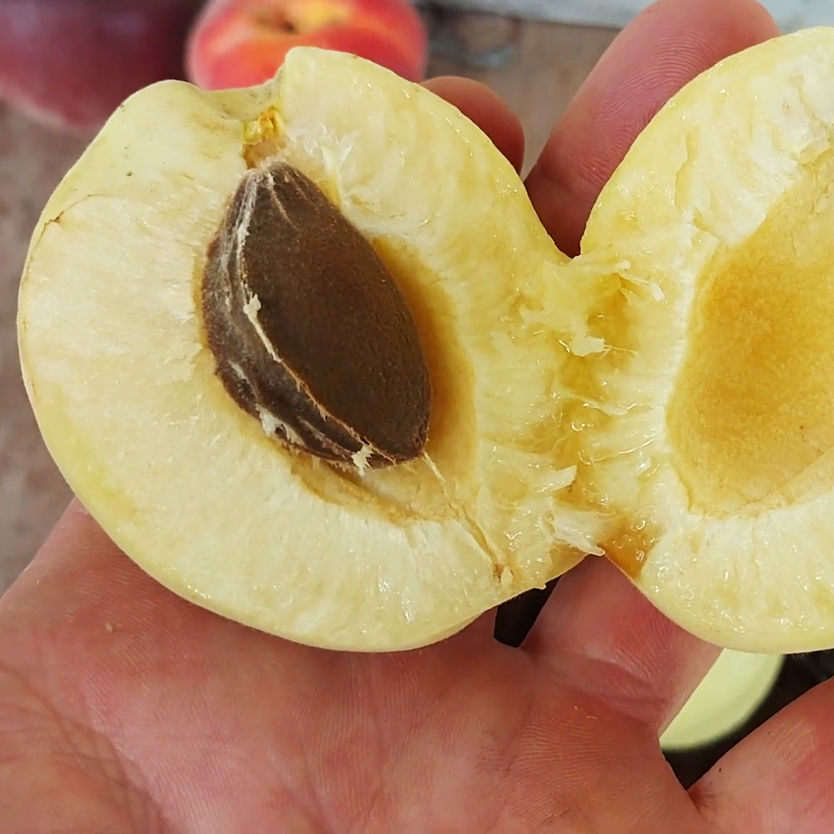 Плоди біло-жовтого відтінку подекуди з рум'янцем. Вони великі  м'ясисті, з кісточкою, що легко відокремлюється.